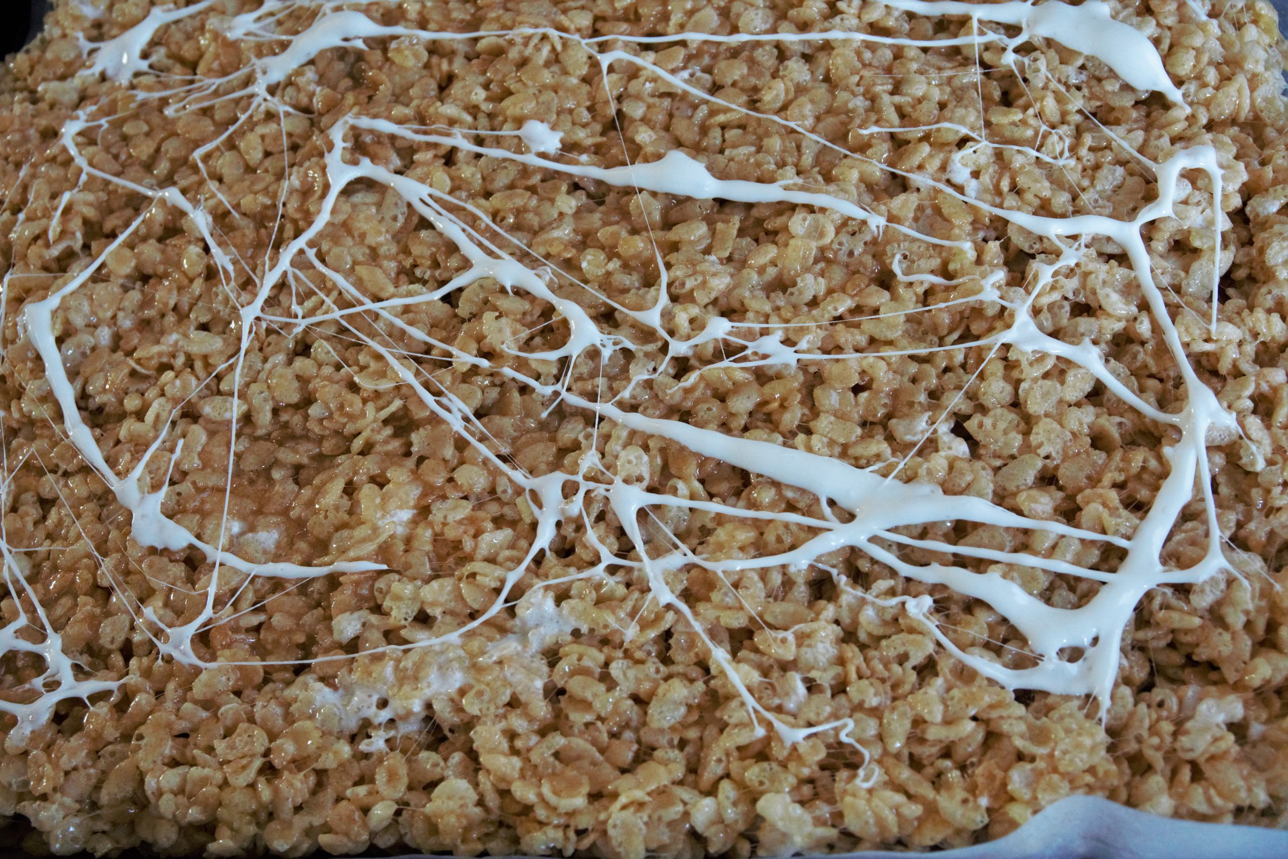 • Melt 1/2 cup mini marshmallows in a microwave safe cup for 15 to 20 seconds on high. Remove and using a spoon or a fork, quickly drizzle melted marshmallow on top of mixture. Make any pattern you like. Get creative. Set aside to cool completely to room temperature. 1 hour. Slice into squares and enjoy.