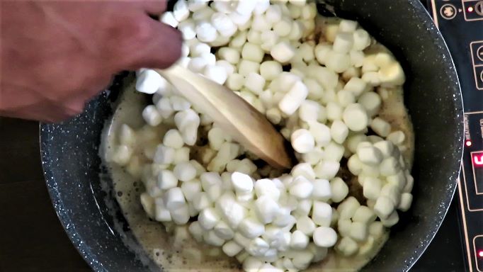 • Add 6 cups mini marshmallows and stir until just completely melted. Stirring constantly. 3 to 4 minutes. Don't overcook or the mixture will harden.