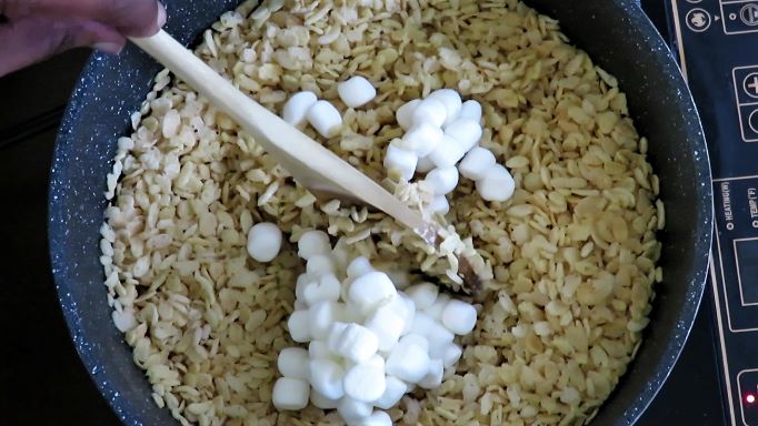• Remove or take off the heat and immediately stir in vanilla and salt. Stir. Working quickly, fold in the cereal and 1 cup of mini marshmallows. Stir/fold together until well coated and added marshmallows just start to melt but are still chunky.