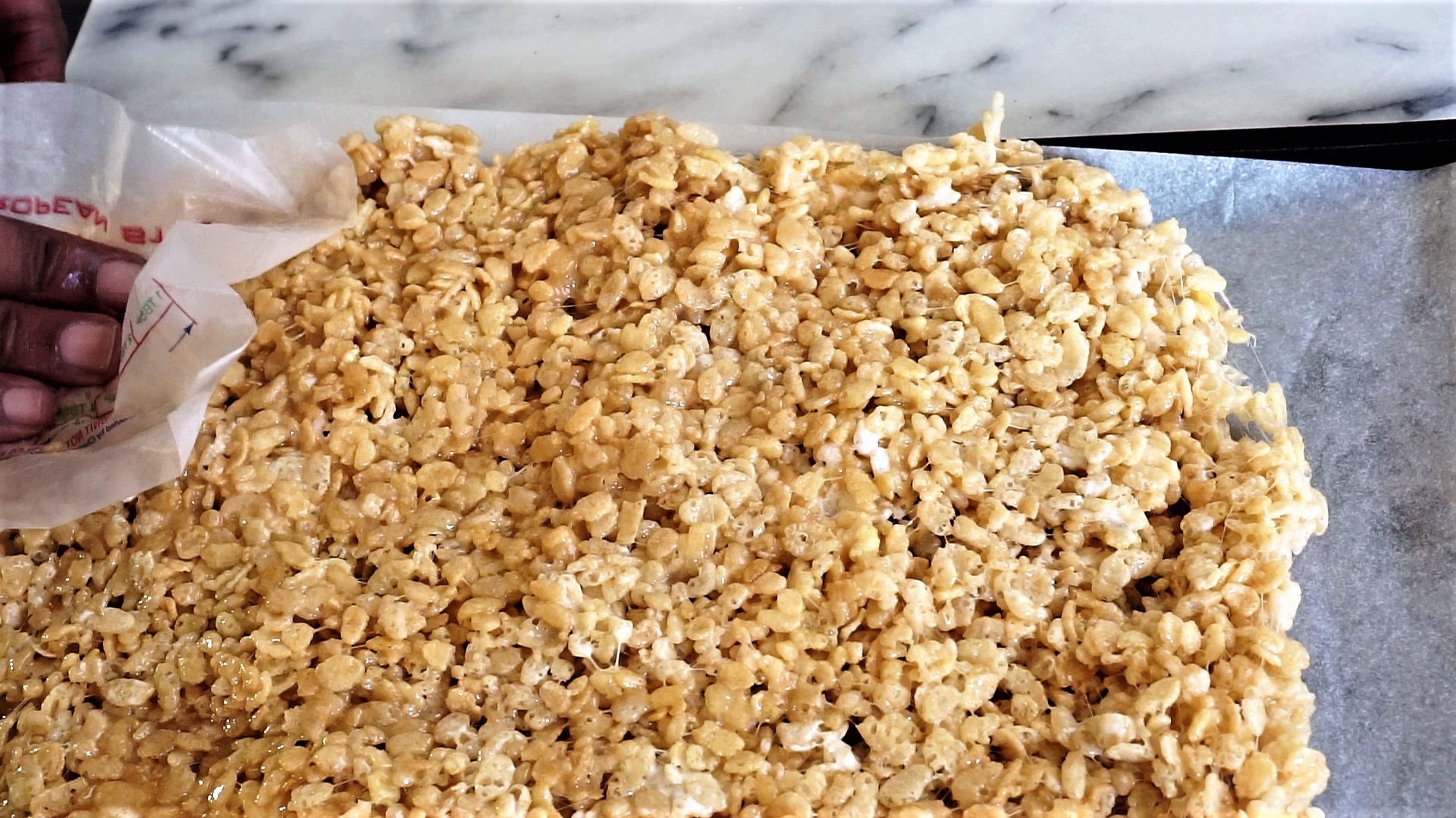 • Transfer quickly to prepared pan and pat down with butter stick wrapper lightly and evenly into the pan. Let cool for a few minutes.