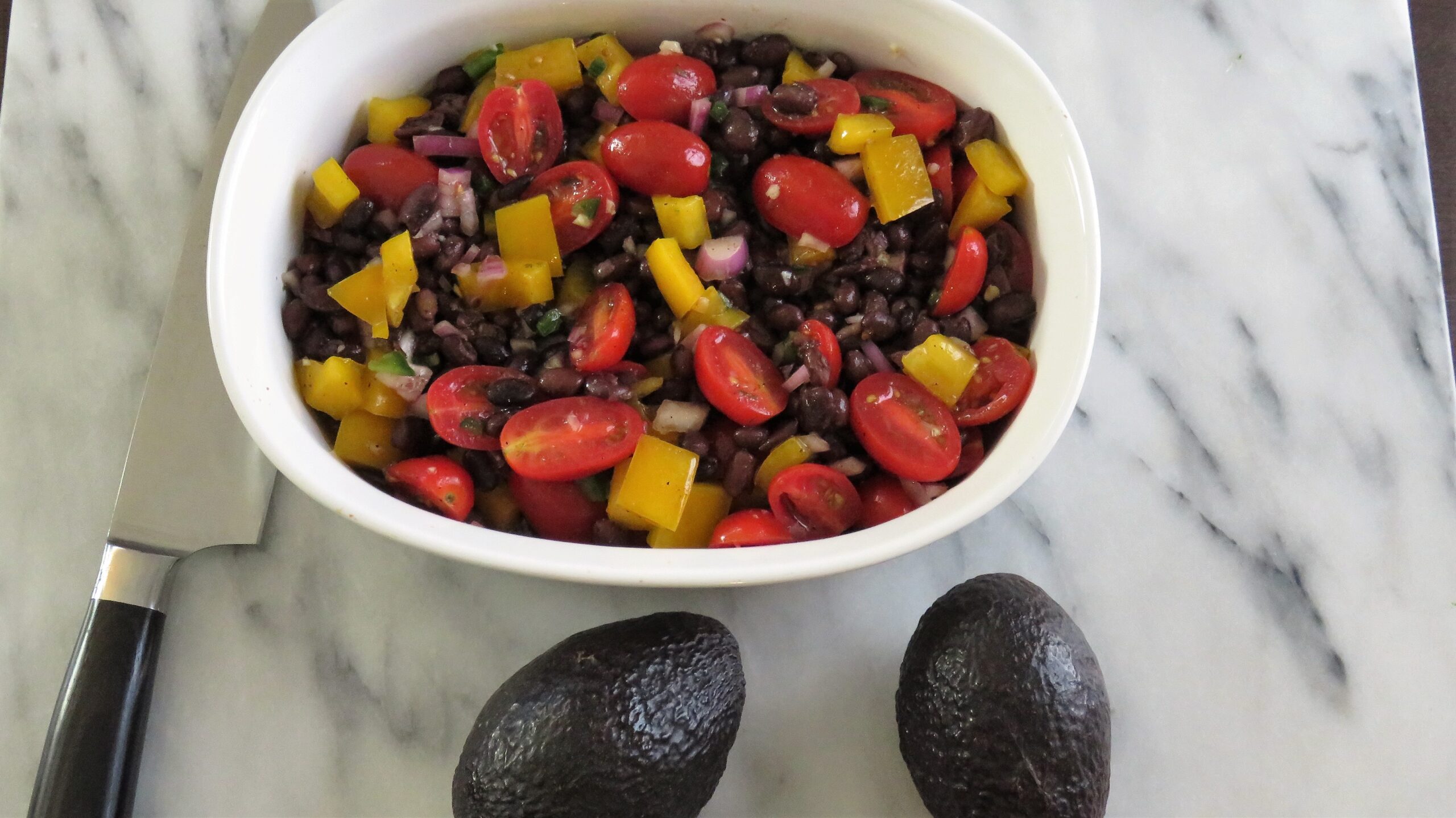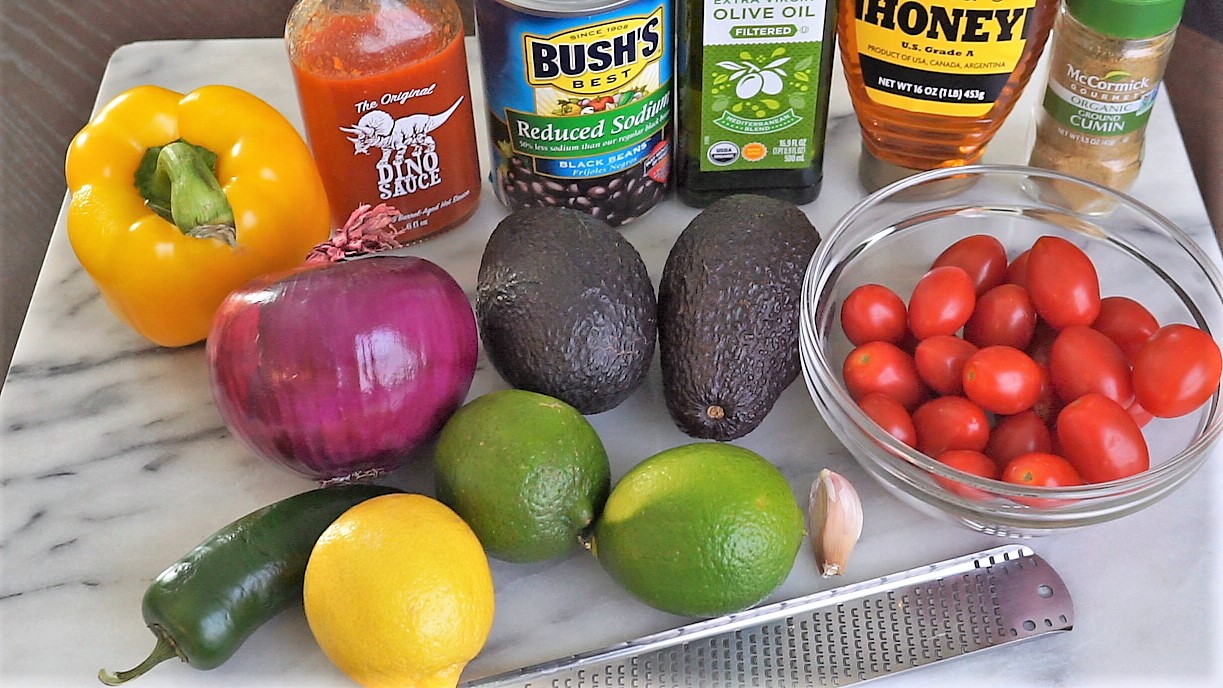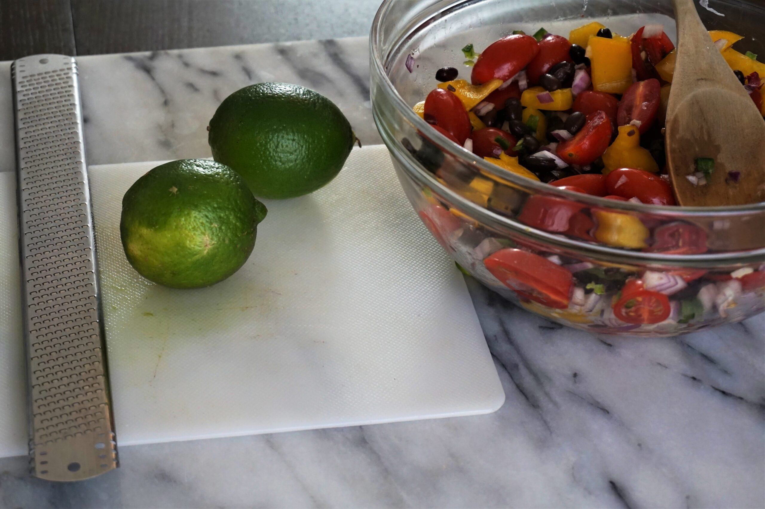 - Place tomatoes, yellow pepper, black beans, red onion, jalapeno peppers and lime zest in a large bowl. Whisk together lime juice, olive oil, salt, black pepper, cumin, cayenne, garlic and honey(optional), hot/pepper sauce and pour over the vegetables. Toss well.