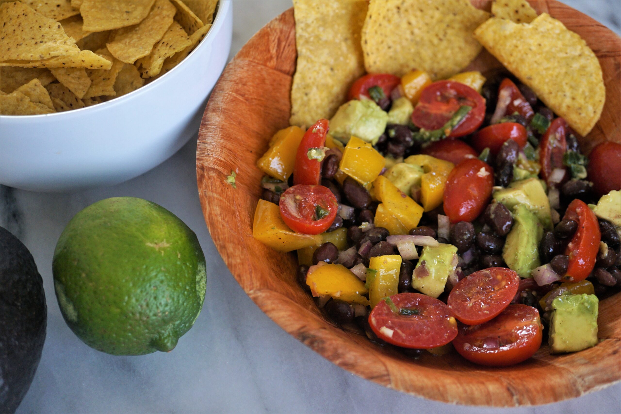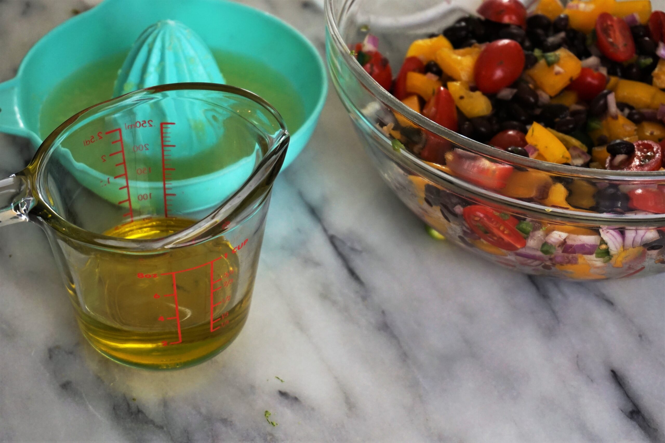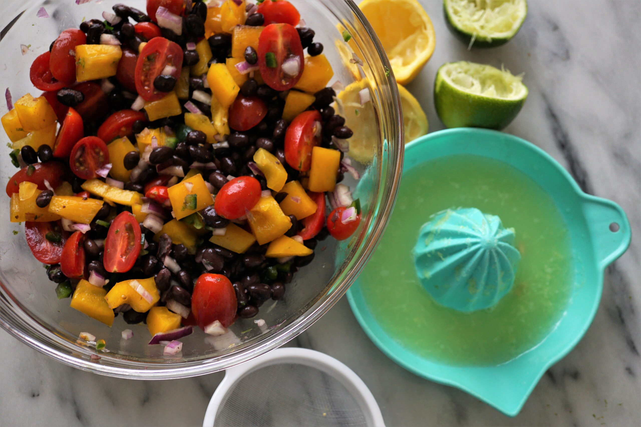 - Place tomatoes, yellow pepper, black beans, red onion, jalapeno peppers and lime zest in a large bowl. Whisk together lime juice, olive oil, salt, black pepper, cumin, cayenne, garlic and honey(optional), hot/pepper sauce and pour over the vegetables. Toss well.