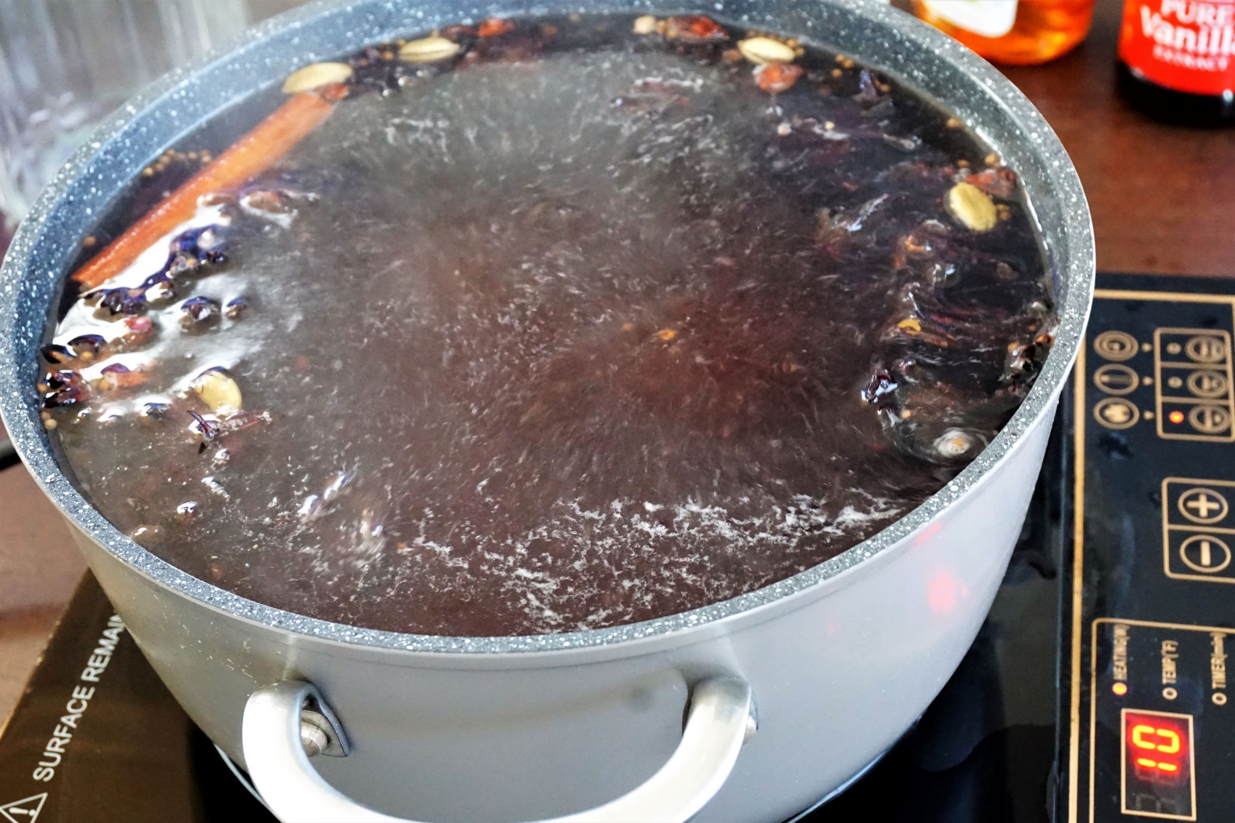 - In a large saucepan or Dutch oven over high heat, bring the water to a vigorous boil. Add the hibiscus flowers, allspice, ginger, star anise, allspice, cardamom pods, peppercorns and red pepper flakes. Stir and bring back to a rolling boil for 15 minutes. The liquid will evaporate some.