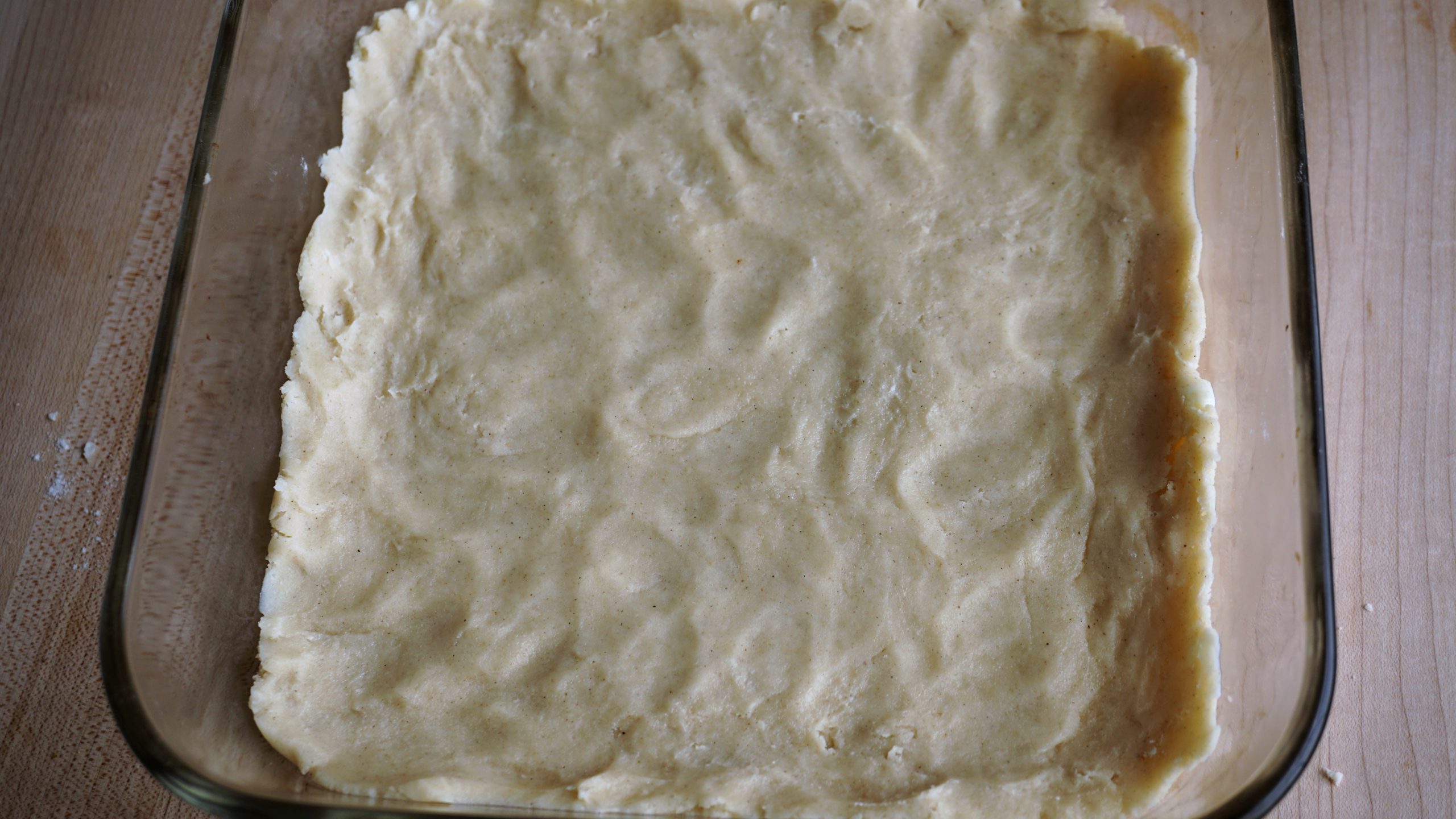 In a bowl, combine flour, sugar and salt. Mix. Add butter pieces and using a pastry blender, forks or clean hands, incorporate butter into flour mix until resembles course or sandy gravel. Bring dough together using hands and place in a greased 8 x 8 inch square baking dish, flattening out with palms of hands to cover all corners. Use fingers to create a ridge along all sides, working quickly to keep butter from melting. Dock dough with a fork and place in oven to par bake for 15 minutes or until just beginning to brown, really blonde. Meanwhile..