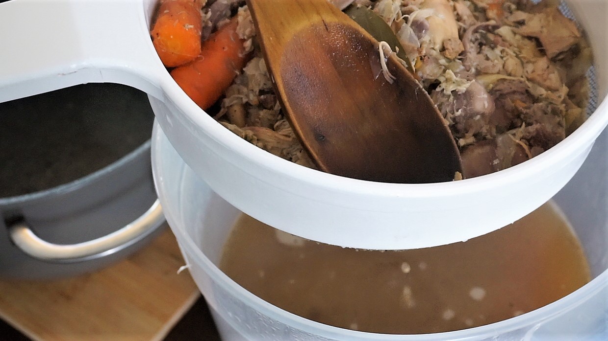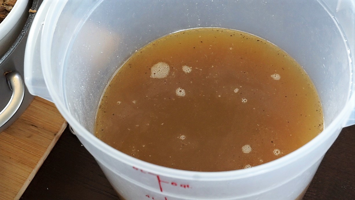 - Carefully strain the stock through a fine mesh strainer into another pot to remove the vegetable solids. Use the stock immediately, or if you plan on storing it, place the pot in a sink full of ice water and stir to cool down the stock. The fat will rise to the top. Strain. Cover and refrigerate for up to one week or freeze.
