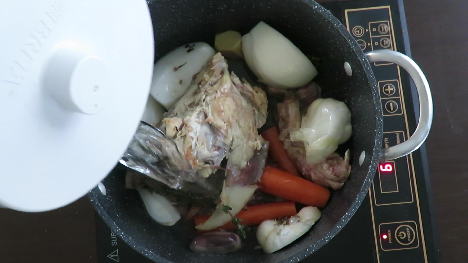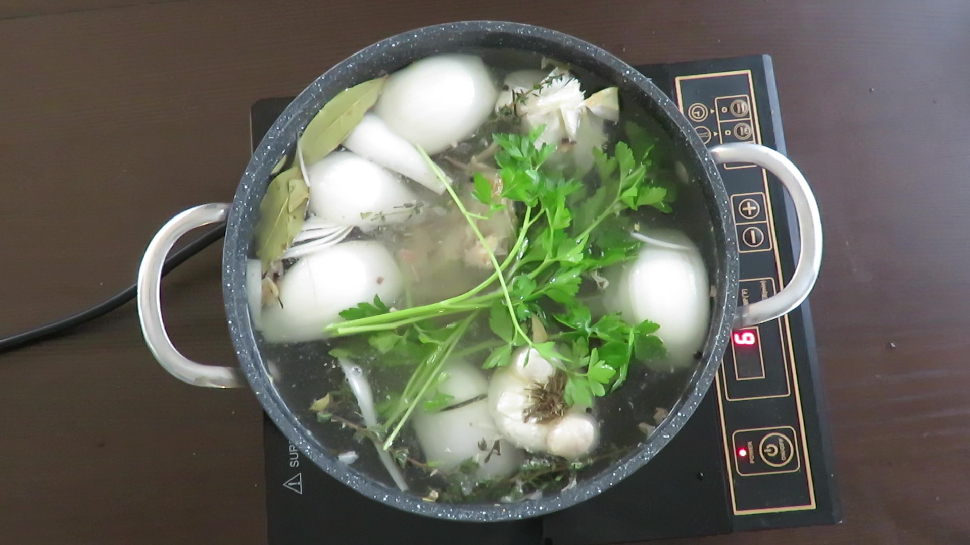- Place a Dutch oven or stock pot over medium heat and coat with cooking oil. Add carcass, gizzards, onion, carrots, thyme, garlic, ginger, bouillon cube, parsley, peppercorns and bay leaves. Pour in only enough cold water to cover (3 quarts). Too much water will make the broth taste weak. Allow to slowly come to a boil. Lower the heat to medium-low and gently simmer for 2 to 3 hours. As it cooks, skim any impurities that rise to the surface. Add a little more water if necessary to keep carcass, bones and veggies covered while simmering.