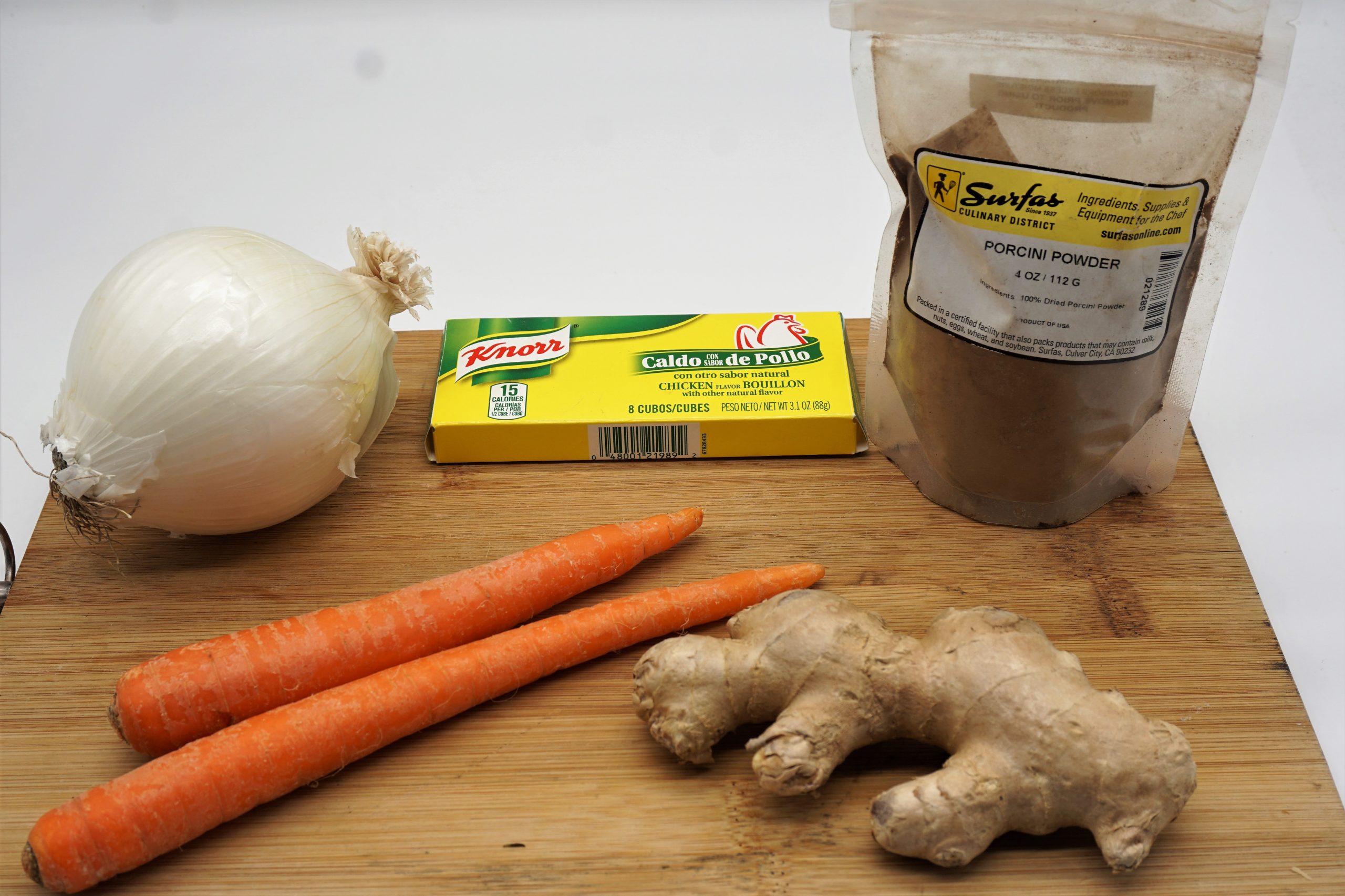 - Place a soup pot or Dutch oven over medium heat and add fat from the stock and CB's garlic herb butter or butter or oil. Add onion, carrots, potatoes, thyme, garlic, and bay leaf. Cook and stir for about 5 to 6 minutes until the vegetables are softened, but not browned. Pour in the chicken stock and bring to a boil. Add porcini powder, shredded tortillas, cream of chicken and soy sauce. Boil for 5 minutes. fold in the cooked chicken and continue to simmer for 30 minutes until the potatoes are fork tender. Sprinkle with chopped parsley before serving.